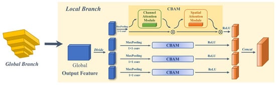We divide the global feature obtained from the inverted pyramid module of the global branch into 4 blocks from left to right, each block being a local feature block ∈ R2048×8×2 (Figure 6). In the local branch, we perform adaptive max pooling and 1 × 1 convolution operations on each local block feature to obtain a reduced local feature representation to 512. Then, we feed each reduced feature block into the CBAM. Channel and spatial attention feature enhancements are applied to the local block feature, dual-domain feature representation is enhanced, and important features such as local stripes after block segmentation are enhanced to obtain {L1, L2, L3, L4} ∈ R512×1×1. Finally, the four feature blocks obtained through attention enhancement were activated using the activation function ReLU, and then concatenated to obtain the final feature output FLocal ∈ R2048×1×1 of the local branch.