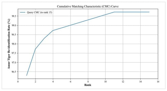 The task of Amur tiger re-ID is similar to the sub-task of person re-ID in image retrieval, so the same testing methods and evaluation indicators, such as the CMC curve and mAP, can be used. This paper uses three indicators for re-ID evaluation: Rank-1 Accuracy, Rank-5 Accuracy, and mean average precision (mAP). Rank-1 is the probability of the first image being retrieved hitting, and Rank-5 is the probability of the first five images being retrieved hitting. Rank-1 can be explained using the formula shown in (4), and the calculation method for Rank-5 is similar to this: