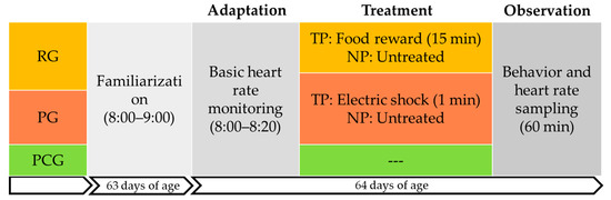 At 64 days of age, the test was conducted at 8:00 a.m. As shown in Figure 2, there were three periods in the PG and RG among the test: (1) the adaptation period was 20 min, which was used to record heart rate. (2) Subsequently, the TPs in the RG and PG were subjected to reward or punishment treatment during the treatment period, with food rewards (0.40 kg of feed, 0.10 kg of apples, and surplus food collected after 15 min) for fasting TPs in the RG, or with electroshock on the buttocks of the TPs in the PG (output voltage 8 V, consecutive stimulations three times, each interval 5 s, each duration 0.2 s). (3) Thereafter, the observation period came after the treatment period. The acoustic panel was removed when the treatment was completed to start the observation period; behavior and heart rate were recorded for one hour.