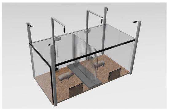 Figure 2. Three-dimensional structure of the test box. The test box is a rectangular test area (300 cm × 150 cm × 130 cm) surrounded by acrylic panels, which is separated into two identical square test areas with side lengths of 150 cm by a metal partition fence (150 cm × 130 cm, barrier diameter 0.5 cm, barrier spacing 5 cm) in the center. In addition, removable acoustic material-covered acrylic panels (the same size as the partitions) were placed at the center partition to fit the partitions, and laminated acoustic glass covered the top of each square test area to ensure that the other piglet was completely shielded from vision and hearing during the piglet treatment process. A platform with a height of 5 cm (150 cm × 25 cm × 5 cm) was set up in an area of 25 cm on each side of the partitions, and the other areas of the test box were paved with rice hulls with a thickness of 5 cm. In each square test area, a trough (20 cm × 17 cm × 10 cm) and a door (40 cm × 50 cm, made of the same material as the test box) were set opposite to each other, placed on both sides of the partition fence, 75 cm away from the partitions, and a water nipple was set up 10 cm near the side of the partitions next to the feed trough. Behavior-recording cameras were set up at 200 cm above each square test area and the corners of the test box.