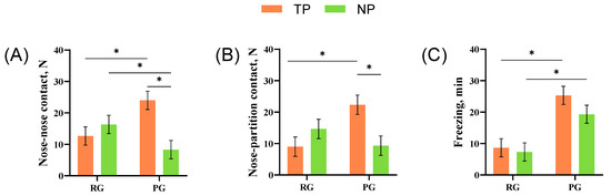 Figure 3. The effect of different treatments or roles on the behavior of pigs: (A) nose–nose contact; (B) nose–partition contact; (C) freezing. * Indicates significant differences between or within groups. The Rewarding Group (RG); the Punishing Group (PG).