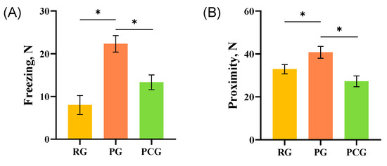 Figure 4. Behavior of pigs in the rewarding, punishing, and the paired control group. (A) freezing; (B) proximity; * Indicates significant differences between groups. The Rewarding Group (RG); the Punishing Group (PG); the Paired Control Group (PCG).