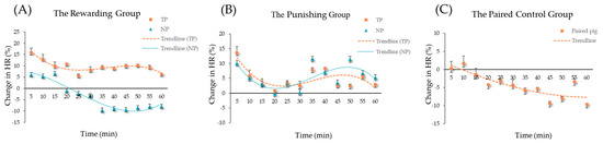 Figure 5. Regression of the heart rate of TPs and NPs with time. (A) The rewarding group; (B) The punishing group; (C) The paired control group.