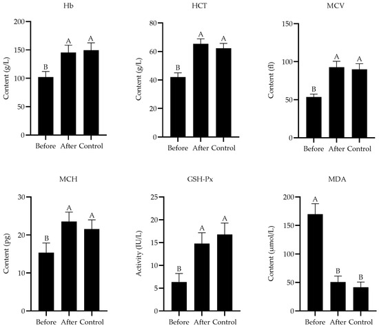 After receiving treatment, the levels of Hb (F2,27 = 4.57, p = 0.004), HCT (F2,27 = 3.94, p = 0.002), MCV (F2,27 = 5.31, p = 0.003), and MCH (F2,27 = 4.29, p = 0.005) were elevated, the activity of GSH-Px (F2,27 = 2.93, p = 0.001) was increased, and the level of MDA (F2,27 = 5.64, p = 0.001) was decreased in the diseased Przewalski’s gazelles (Figure 1). There were no significant differences in these indicators between the after group and control group (p > 0.05). All Przewalski’s gazelles were successfully cured in the experimental intervention, and no other adverse reactions were observed.
