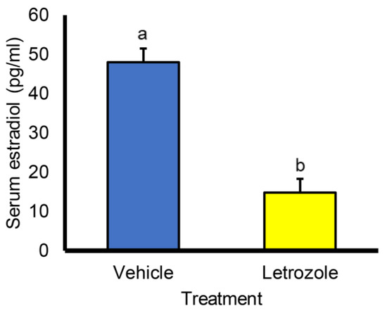 Serum estradiol is rapidly reduced following letrozole treatment. Values represent means ± SEM from 26 littermate pairs of 2-week old boars one week after treatment with 0.1 mg letrozole/kg body weight. Data redrawn from animals and treatments previously described [9,10,11,13]. a, b p < 0.0001.