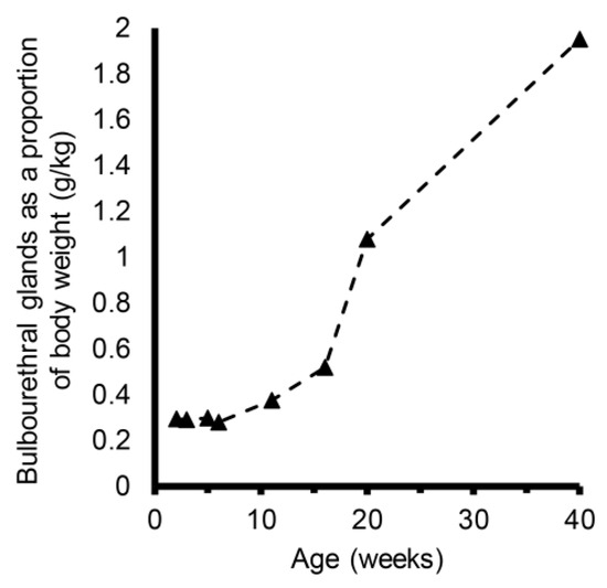 Bulbourethral glands as a proportion of body weight in control boars. Black triangles represent mean proportional weights (g/kg) from 3 to 6 boars at each age and dashed line illustrates profile. Gland weights appeared to increase at a faster rate in the peripuberal interval (16–20 weeks) than earlier or later although allometric growth between 6 and 11 weeks of age appeared similar to the rate of allometric growth between 11 and 16 weeks of age.