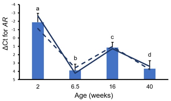 Delta Ct Values for AR. Bars represent means from control and treated boars at each age with SEM from analysis. a, b p < 0.001. a, c; c, d p < 0.05. b, c; a, d p < 0.01. Solid lines represent values only from control boars and dashed lines represent values from littermates treated with letrozole (low estrogen).