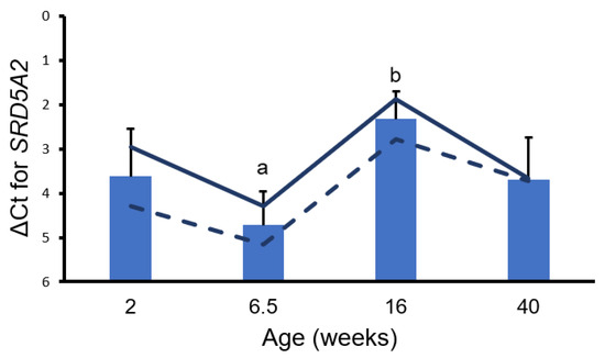 Delta Ct values for SRD5A2. Bars represent means from control and treated boars at each age with SEM from analysis; a, b p < 0.05. Solid lines represent values only from control boars and dashed lines represent values from littermates treated with letrozole (low estrogen).