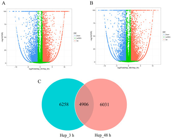 (A) Volcano Plot of DEG distribution trends in the Hep_3 h vs. Hep_0 h comparison. Each dot represents one gene. Red dots represent up-regulated genes and blue dots represent down-regulated genes. Green dots represent no DEGs. (B) Volcano Plot of the distribution trends of DEGs in the Hep_48 h vs. Hep_0 h comparison. (C) Venn diagrams show the DEGs in the Hep_3 h vs. Hep_48 h comparison.
