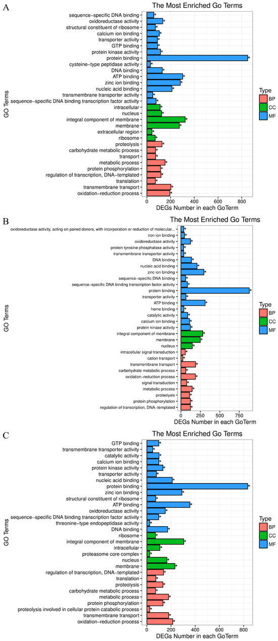 Gene Ontology assignments of DEGs in the (A) Hep_0 h vs. Hep_3 h, (B) Hep_0 h vs. Hep_48 h, and (C) Hep_3 h vs. Hep_48 h comparisons. (* means correct p-value < 0.05).