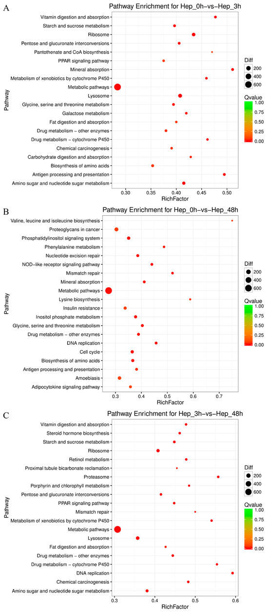 Comparative KEGG pathways analysis in the (A) Hep_0 h vs. Hep_3 h, (B) Hep_0 h vs. Hep_48 h, and (C) Hep_3 h vs. Hep_48 h comparisons.