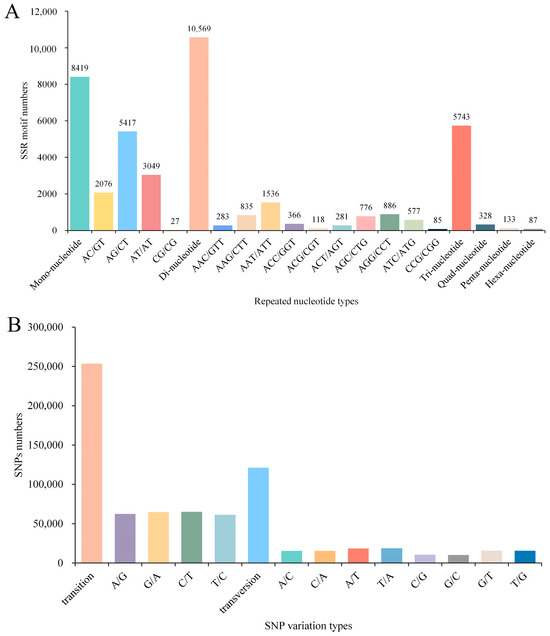 A total of 25,279 SSRs were identified across 85,984 unigenes, with the majority of SSR repeats being di-nucleotide repeats (10,569, 41.81%), followed by mono-nucleotide repeats (8419, 33.30%) and tri-nucleotide repeats (574,379, 22.72%), and the rest being quad-nucleotide repeats (328, 1.30%), penta-nucleotide repeats (133, 0.53%), and hexa-nucleotide repeats (87, 0.3%). Among the di-nucleotide repeats, AG/CT was the main type, followed by AT/AT and AC/GT. The most common repeat sequences in tri-nucleotide repeats were AAT/ATT and AGG/CCT (Figure 4A). Detailed SSR results and corresponding primers are presented in Table S4. In addition, a total of 374,631 SNPs were predicted, including 253,540 transition and 121,091 transversion, with C/T (65,001) and T/A (18,811) SNP types being the most frequent in transition and transversion, respectively (Figure 4B).