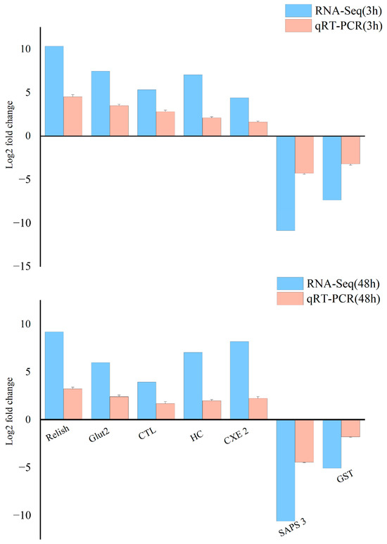 Seven DEGs were chosen for validation by qRT-PCR. The results showed that, compared to the control group, the expression levels of relish, Glut 2, HC, CXE 2, and CTL were up-regulated, while SAPS 3 and GST were down-regulated. These expression trends were consistent with those observed in the high-throughput sequencing data (Figure 5), confirming the precision and reliability of the sequencing results.