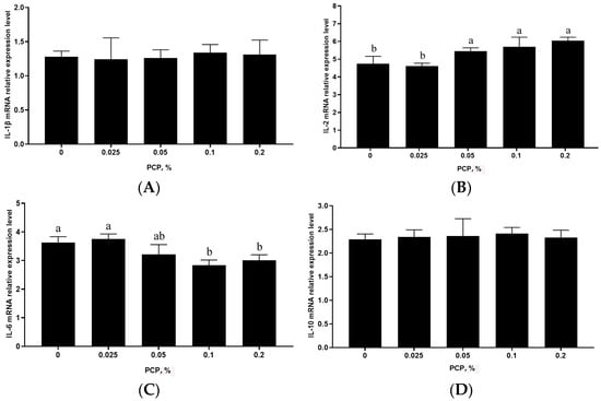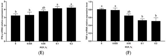 The effect of PCP supplementation on cytokine mRNA levels in the spleen of weaned piglets. (A) IL-1β; (B) IL-2; (C) IL-6; (D) IL-10; (E) IFN-γ; (F) TNF-α. β-actin served as the housekeeping gene. In the figure, different lowercase letters above the columns denote significant differences (p < 0.05).