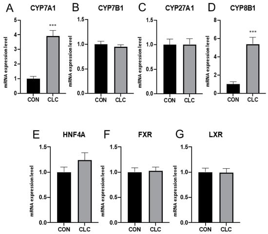 Expression of bile-acid metabolic genes in liver tissue. (A) CYP7A1, cytochrome P450 family 7 subfamily A member 1 (B) CYP7B1, cytochrome P450 family 7 subfamily B member 1 (C) CYP27A1, cytochrome P450 family 27 subfamily A member 1 (D) CYP8B1, cytochrome P450 family 8 subfamily B member 1 (E) HNF4A, hepatocyte nuclear factor 4 alpha (F) FXR, farnesoid X receptor (G) LXR, liver X receptor. Unpaired t-test, symbols indicate statistical significance, *** p ≤ 0.001. CON: control; CLC: high cholesterol with low choline. Data presented as mean ± S.D. (n = 10).