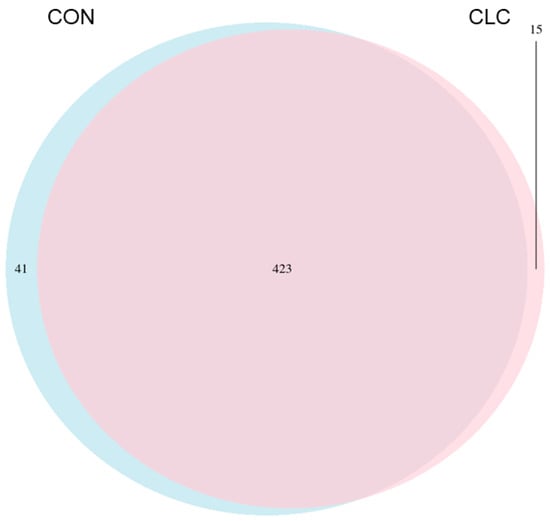 The Venn diagram analysis of 479 OTUs in the cecum of hens. A total of 41 and 15 OTUs were found in control and CLC groups, respectively. Furthermore, 423 OTUs were found in the control and CLC groups. CON: control group with basal diet; CLC: CLC group with high-cholesterol and low-choline diet. (n = 10).