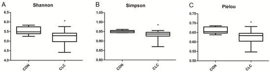 Differences in bacterial community diversity in the cecum of hens between CON and CLC group. The diversity indices of (A) Shannon, (B) Simpson and (C) Pielou are shown. CON: control group with basal diet; CLC: CLC group with high-cholesterol and low-choline diet. * p ≤ 0.05. Data presented as mean ± S.D. (n = 10).