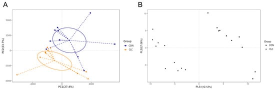 The similarity of the identified OTUs between groups: (A) Principal components analysis (PCA) of the bacterial community structure between control and CLC group. Each symbol represents each gut microbiota; (B) partial-least-squares discriminant analysis (PLS-DA). Each symbol represents each gut microbiota. Square symbol represents control group; circle symbol represents CLC group. CON: control; CLC: high cholesterol with low choline. (n = 10).