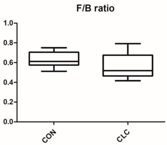 Here, we determined the gut microbiome composition to clarify the influence between the intestine and the liver. A total of 479 OTUs were found in cecal contents, shown in a Venn diagram in Figure 2. Among these OTUs, 423 were commonly observed in both groups, whereas 41 OTUs existed only in CON and 15 OTUs existed only in CLC. For alpha-diversity, the abundance of microbiota was significantly enriched in CON (p < 0.05), which was assessed by the Shannon, Simpson, and Pielou indices (Figure 3). For beta-diversity, a principal component analysis (PCA) based on weighted Unifrac demonstrated that OTUs from CON and CLC were distinctly separated (Figure 4A, PC1:27.4%; PC2:23.7%). Similar to PCA, a partial-least-squares discriminant analysis (PLS-DA) illustrated the structural differences between groups. (Figure 4B, PLS1:12.12%; PLS2:7.06%). Compared to CON, CLC tended to have a lower Firmicutes/Bacteriodetes (F/B) ratio; nevertheless, it showed no significance (Figure 5).