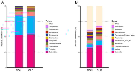 The relatively abundant microbiota in different taxonomic levels. (A) Phylum level. (Bacteroidetes—CON: 52.38%, CLC: 53.76%; Firmicutes—CON: 38.26%, CLC: 29.73%; Proteobacteria—CON: 6.47%, CLC: 7.49%; Epsilonbacteraeota—CON: 3.60%, CLC: 3.64%; Synergistetes—CON: 1.57%, CLC: 1.28%; Deferribacteres—CON: 0.73%, CLC: 1.89%; Cyanobacteria—CON: 1.67%, CLC: 0.76%; Actinobacteria—CON: 0.26%, CLC: 0.68%; Patescibacteria—CON: 0.20%, CLC: 0.31%; Lentisphaerae—CON: 0.14%, CLC: 0.21%; Others—CON: 0.12%, CLC: 0.24%) (B) Genus level. (Bacteroides—CON: 32.13%, CLC: 35.96%; Alistipes—CON: 6.16%, CLC: 8.28%; Phascolarctobacterium—CON: 6.11%, CLC: 7.19%; Helicobacter—CON: 3.60%, CLC: 3.64%; Prevotellaceae_UCG_001—CON: 3.37%, CLC: 2.20%; Megamonas—CON: 2.06%, CLC: 3.07%; [Ruminococcus]_torques_group—CON: 2.30%, CLC: 1.65%; Succinatimonas—CON: 1.70%, CLC: 2.23%; Barnesiella—CON: 2.50%, CLC: 1.32%; Parasutterella—CON: 1.62%, CLC: 2.13%; Others—CON: 38.46%, CLC: 32.35%. Each color represents a different taxonomic unit (n = 10). CON: control; CLC: high cholesterol with low choline.
