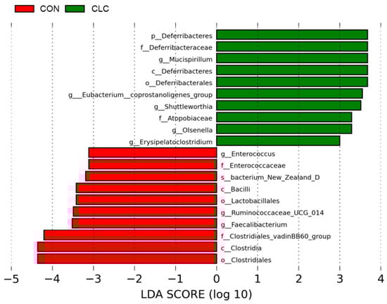 LEfSe analysis showing the most differentially abundant taxa between control and CLC group. Only taxa with LDA > 3 are shown. The letter in front of the strains indicates the taxon level; p, phylum; c, class; o, order; f, family; g, genus; s, species (n = 10). CON: control; CLC: high cholesterol with low choline.