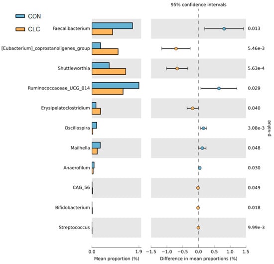 Figure 7 presents the bacterial taxa that exhibited significant differences (p ≤ 0.05) between the CON and CLC groups, as determined by LEfSe and LDA analysis. The CLC group displayed a higher abundance of Mucispirillum, Eubacterium_coprostanoligenes_group, Shuttleworthia, and Olsenella, while the CON group exhibited a higher abundance of Enterococcus, Ruminococcaceae_UCG_014, and Faecalibacterium. Additionally, we performed Welch’s t-test to compare the abundance of gut bacteria between the two groups and identify those with significant differences (p ≤ 0.05), as illustrated in Figure 8. The CON group demonstrated a significantly higher abundance of Faecalibacterium, Ruminococcaceae_UCG_014, Oscillospira, Maihella, and Anaerofilum. Conversely, the CLC group displayed a significantly higher abundance of [Eubacterium]_ coprostanoligenes_group, Shuttleworthia, and Erysipelatoclostridium.