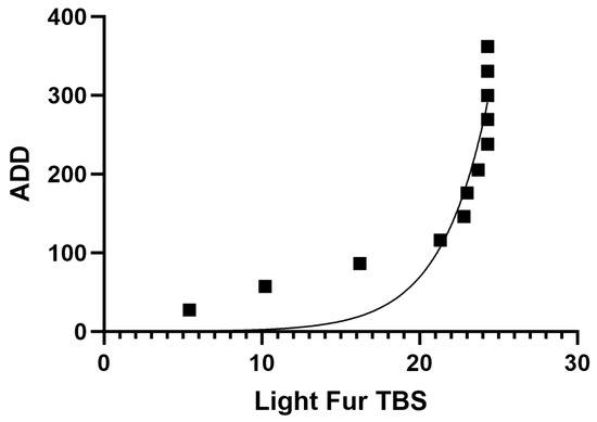 Nonlinear regression for light fur cats (n = 3) TBS vs. ADD resulted in an exponential relationship (R2 = 0.84). Light-fur TBS vs. ADD was significantly different (Z = 78, p = 0.0005).