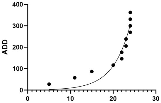 Field temperature and relative humidity were collected via four data loggers (HOBO MX2300, Onset Computer Corporation, Bourne, MA, USA). Body temperatures and ground temperatures were recorded daily throughout the study via an infrared digital thermometer (Infrared Thermometer GM321, Benetech, China). In order to calculate the accumulated degree days, the field temperature data collected by data loggers were corrected by using the nearest certified weather station (GHCND:USW00014835) to account for any variability [29]. Daily average field temperatures were collected and plotted against the certified weather station daily averages, and the resulting equation was used to correct the field temperature (corrected field temperature = 1.2044x − 0.9103) [29,30,31]. This equation was used for each daily mean temperature to calculate a corrected field temperature value. This process was repeated for each day of the study. The values were calculated and then summed to calculate ADD (Table 2).