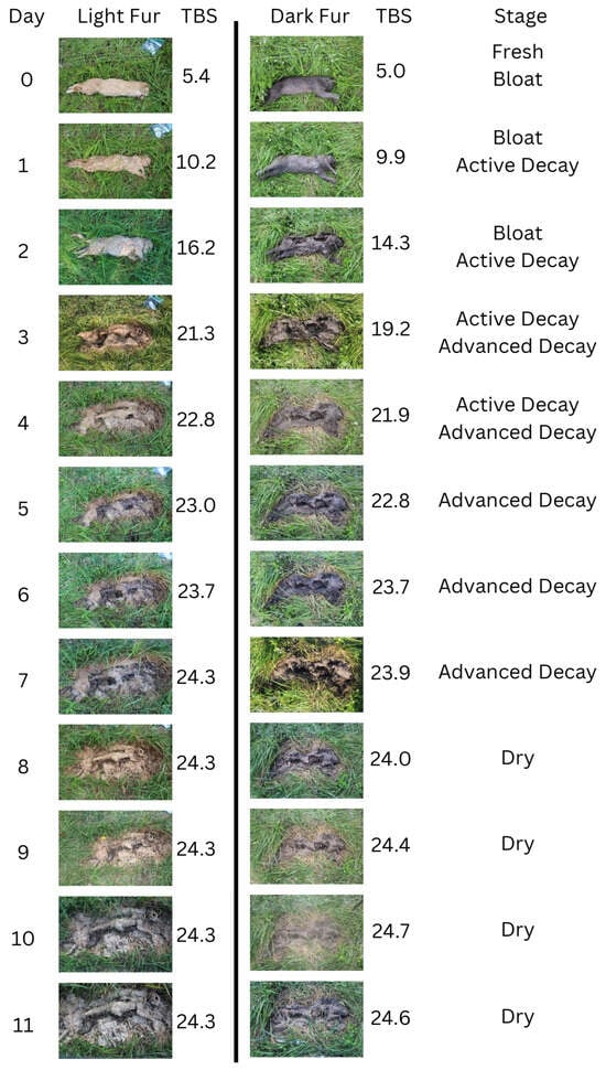 Another area of contention is defining the stages of decomposition of furred animals, durations of each stage, or terms and definitions of each stage (Table 1). This difficulty stems from the continuous process of decomposition with little to no defined boundaries of when one stage begins and ends. Assessment of each stage also depends upon visual assessments that are subjective to the observer [16]. Decomposition begins the moment that death occurs, with autolysis and putrefaction occurring immediately [17]. The stages of decomposition described here are fresh, bloat, active decay, advanced decay, and dry [17,18,19]. The fresh stage can be described as no discoloration and no insect activity [17]. Bloat can be described as when the body begins to decompose and microorganisms proliferate, which produces gases such as methane and ammonia; these gases then inflate the abdominal cavity, giving a bloated appearance [19,20]. Active decay can be described as moist decomposition with extensive insect activity, and the body may have a deflated appearance now due to insect feeding breaking the skin layers [17]. During this stage, the temperature of the carcass peaks [19]. Advanced decay is continued moist decomposition with some bone exposure, transitioning to a dryer mummified stage [12]. Finally, there is the dry stage, when there is only dry skin and no insect activity [19,21]. Visual assessment of the morphological changes introduces additional difficulty due to fur concealing the surface of the skin. Many research studies have used pigs because they have the most similar decomposition to human [22]. Few studies have used cats, or even animals with fur, as the animal model when analyzing decomposition [7,19,21,23]. When assessing the degree of decomposition, whether the remains are human or animal, the process is very subjective to the observer and may result in different conclusions. A way to remedy this is to implement the TBS method, which has been demonstrated to show low levels of any interobserver bias [16].