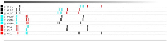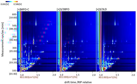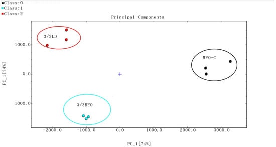 Although major differences in VFC profile were observed between alternative oil groups and the MFO-C group, minor differences were also found between the two alternative oil groups. The 3/3BFO group was rich in 2-methylbutanal and 3-methylbutanal, which are generated from leucine and isoleucine, respectively, via Strecker degradation, and have a strong burnt and apple odor flavor, respectively []. The 3/3LD group was rich in (E)-3-penten-2-one, 2,3-butanedione, ethyl propanoate, and butanal. The 2,3-butanedione, which has a buttery and caramel odor [], can be formed by the Maillard reaction [], while butanal, which has a pungent and intense flavor, might be attributed to the synergistic effect of endogenous enzymes and microorganisms in the storage process []. Therefore, the characteristic flavors of the 3/3BFO and 3/3LD groups could be mainly related to the production processes and storage condition of these two oils. Moreover, the distance between 3/3LD and MFO-C was larger than that between 3/3BFO and MFO-C, which could also be explained by the oil production processes and storage condition.