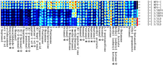 A total of 50 volatile flavor components were detected from all muscle samples, of which 43 were successfully identified (Table 11, Figure 1 and Figure 2). Most of these compounds were small-molecular alcohols, ketones, and aldehydes. Aldehydes are the most abundant volatile organic compounds in the muscle of tiger puffer, followed by ketones. The difference in volatile organic compounds between MFO-C and 3/3LD was greater than that between MFO-C and 3/3BFO (Figure 3 and Figure 4). Compared with the MFO-C group, the 3/3LD group showed a lower abundance of octanal-M, octanal-D, 1-heptanol, oct-1-en-3-ol, cyclohexanone, benzaldehyde-M, benzaldehyde-D, n-hexanol, 2-methylbutanal, (E)-2-hexenal-M, (E)-2-hexenal-D, 2-heptanone, 2-pentanone, 2,3-hexanedione, (E)-2-pentenal-M, (E)-2-pentenal-D, 3-methylbutanal, pentan-1-ol-M, pentan-1-ol-D, 3-pentanone, 2-hexanone, (E)-hept-2-enal, methylpyrazine, propanoic acid, heptanal-M, pentanal-D, heptanal-D, and methyl isobutyl ketone-M, but a higher abundance of 2,3-butanedione, ethyl propionate, butyraldehyde, acetone, 2,3-pentanedione, and 2-butanone (Figure 2). Compared with the MFO-C group, the 3/3BFO group showed a lower abundance of 3-pentanone, (E)-2-pentenal-M, (E)-2-pentenal-D, 2,3-hexanedione, (E)-2-hexenal-M, (E)-2-hexenal-D, (E)-hept-2-enal, benzaldehyde-M, benzaldehyde-D, octanal-M, octanal-D, 1-heptanol, oct-1-en-3-ol, cyclohexanone, n-hexanol, 2-heptanone, pentan-1-ol-M, pentan-1-ol-D, 2-pentanone, and heptanal-D, but a higher abundance of 2,3-butanedione, ethyl propionate, 2,3-pentanedione, and acetone (Figure 2).
