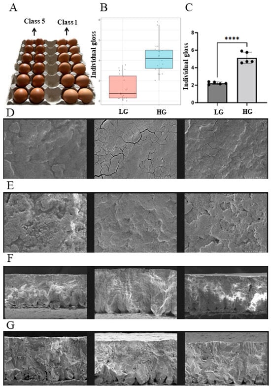(A) HG (high-gloss) eggs (class 5) and LG (low-gloss) eggs (class 1). (B) Boxplot of candidate chickens’ gloss value (n = 20). (C) Individual gloss values of eggs of HG and LG hens used for RNA-seq and WGRS (n = 5). Symbol “****” indicated a significant difference at p < 0.0001. (D–G) Scanning electron microscope (SEM) images of HG and LG eggshells. (D) HG eggshell surface. (E) LG eggshell surface. (F) HG eggshell intersecting surface. (G) LG eggshell intersecting surface. Scale bars for SEM images: 100 μm (D,E), 200 μm (F,G).