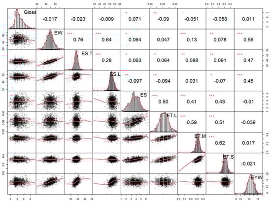The correlation matrix plot of eggshell gloss among different eggshell traits. On the diagonal are the univariate distributions, plotted as histograms and kernel density plots. On the right of the diagonal are the phenotypic pairwise correlations, with red stars indicating significance levels (*, p < 0.05, **, p < 0.01, ***, p < 0.001). On the left side of the diagonal is the scatter-plot matrix, with LOESS smoothers in red to illustrate the underlying relationship. Abbreviations: EW: egg weight; ES. T: egg shape index—transverse diameter; ES. L: egg shape index—longitudinal diameter; ES: eggshell strength; ET. L: eggshell thickness—blunt end; ET. M: eggshell thickness—equatorial part; ET. S: eggshell thickness—sharp end; EYW: egg yolk weight.