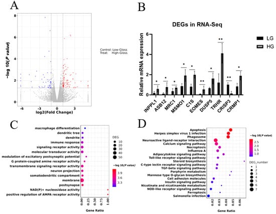 (A) The volcano plot maps of all DEGs between HG and LG uteruses. Red dots represent significantly upregulated genes and blue dots represent significantly downregulated genes. (B) Ten DEGs were validated by qPCR. Symbols “*” and “**” indicate a significant difference at p < 0.05 and p < 0.01, respectively. (C) GO enrichment analysis of DEGs. (D) KEGG pathway enrichment analysis of enriched DEGs. Abbreviations: DEGs, differentially expressed genes; HG, high gloss; LG, low gloss; GO, Gene Ontology.