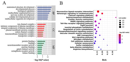 GO enrichment analysis and KEGG pathways of SNP sites located within genes. (A) GO enrichment analysis in BP, CC and MF. The blue, orange and green columns represent BP, CC and MF, respectively. (B) KEGG pathway enrichment analysis. Abbreviations: MF, molecular function; CC, cellular component; BP, biological process.