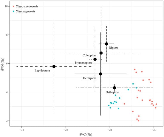 Orthoptera, Hemiptera, Hymenoptera, Coleoptera, Diptera, and Lepidoptera were found to be common food source of S. yunnanensis and S. nagaensis (Table 1 and Figure 2 and Figure 3), as the cumulative contribution rate of the six orders of insects to the diets of both species reached 99.97% (Table 1). This was consistent with field observations showing that S. yunnanensis and S. nagaensis are primarily insectiorous and rarely eat plants. This is why the results reflect the food sources and contribution rates of the two nuthatches, even though samples were not collected from all food sources. The insect prey composition of S. yunnanensis and S. nagaensis overlapped, which is consistent with the results seen for Sitta tephronota and Sitta neumayer, based on gastrointestinal tract content analysis [5]. Although the insects in the diets of S. yunnanensis and S. nagaensis were the same at the order level, the proportions of each component differed significantly; S. yunnanensis fed predominantly on Orthoptera (78.69%), Hemiptera (7.76%), and Coleoptera (3.96%), while S. nagaensis fed mainly on Orthoptera (45.56%), Hemiptera (22.41%), and Hymenoptera (9.56%). These results differ from those for S. neumayer, which primarily preyed on Coleopterans, Hemipterans, and Lepidopterans [5]. In our study, Lepidopterans were not identified as a main food for either S. yunnanensis or S. nagaensis (Table 1), which may be caused by different research methods. Stable isotope analysis mainly reflects the actual intake, digestion, and assimilation information of food, while gastrointestinal content analysis mainly reflects information on food intake. The overlapping of food resources between S. yunnanensis and S. nagaensis is consistent with the adoption of strategies for food resources observed in other sympatric species. For example, a feather isotope analysis of three sympatric species of closely related seabirds revealed substantial overlap in food resources [21], and Australian snubfin and humpback dolphins that co-exist in the same domain have overlapping dietary resources but different dietary preferences [37].
