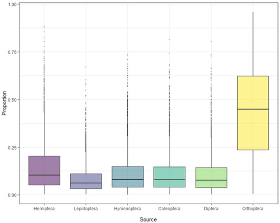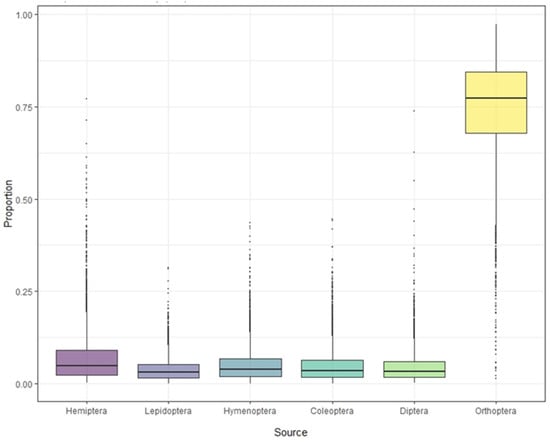 Stable isotope analysis of feathers of S. yunnanensis and S. nagaensis showed that the cumulative contribution rate of insects in the six orders to their diet reached 99.97% (Table 1). Although not all food species were collected, the results effectively reflect the composition and contribution rate of the main food sources. The contribution rates of food sources in feather samples from S. yunnanensis were as follows: Orthoptera > Hemiptera > Coleoptera > Hymenoptera > Diptera > Lepidoptera; for S. nagaensis the order was Orthoptera > Hemiptera > Hymenoptera > Coleoptera > Diptera > Lepidoptera. The contribution rate of Orthoptera to the diet of S. yunnanensis based on feather samples was as high as 78.69%, while its contribution to the diet of S. nagaensis was 45.56%, indicating that it was an important food source for both species (Figure 2 and Figure 3, Table 1). Lepidoptera had the lowest dietary contribution rates 2.29% for S. yunnanensis and 4.12% for S. nagaensis (Figure 2 and Figure 3, Table 1).