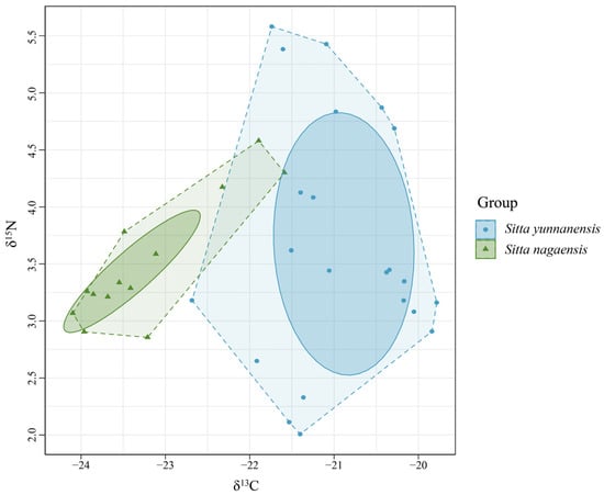 The δ13C values of S. yunnanensis and S. nagaensis feathers were significantly different (p < 0.001), indicating that food resources were differentiated and feeding niches were separated. There was no significant difference in δ15N values (p = 0.59), indicating that the species occupied the same trophic position (Figure 1).