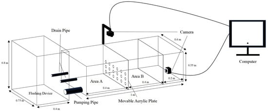 Three levels of shelter coverage (25%, 50%, 75%) and seven different combinations of three types of shelters (PVC pipes: φ 0.028 m, length 0.1 m; water grass: length 0.1 m; stone: length 0.08 m, width 0.06 m) with 50% coverage were set up (Table 2), including 14 groups with three replicates each, and the control group without shelters. The experiment lasted for 24 h. All experimental conditions were consistent with the acclimation and the photoperiod consisted of 12 h light and 12 h dark. A transparent perforated acrylic plate separating areas A and B of the blue test device (Figure 1) was used, and two cameras were mounted directly above and at the bottom. A small flushing device (length 0.4 m × width 0.75 m × height 0.8 m) was installed in front to simulate the water flow rate.
