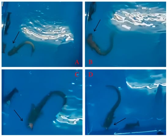 Predatory process of S. asotus on P. clarkii. The letters (A–D) indicated different serial numbers, and the arrows pointed to the momentary behavior of S. asotus preying on P. clarkii.