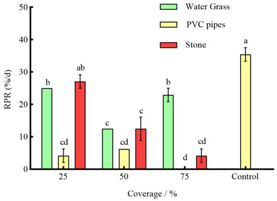 The RPR of P. clarkii under different coverage rates. The difference in letters indicated that there were significant differences between groups (p < 0.05), and the same applies below.