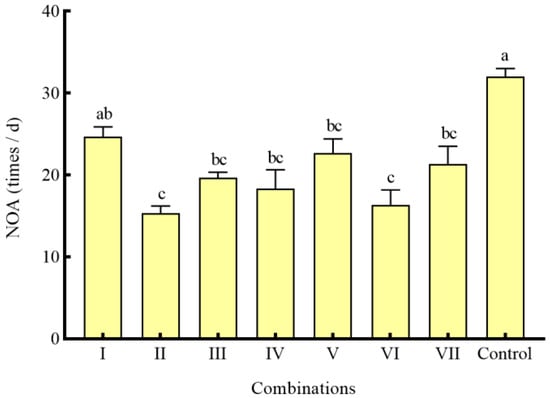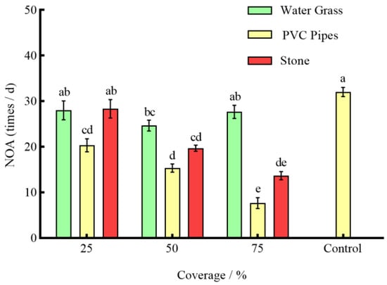 The NOA of P. clarkii under different combinations of shelters. The difference in case letters indicated that there were significant differences between groups (p < 0.05).