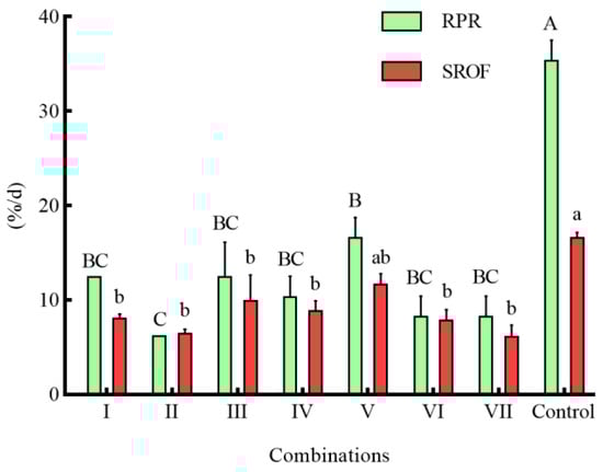 The RPR of P. clarkii and SROF of S. asotus on P. clarkii under different combinations of shelters. The difference in case letters indicated that there were significant differences between groups (p < 0.05).