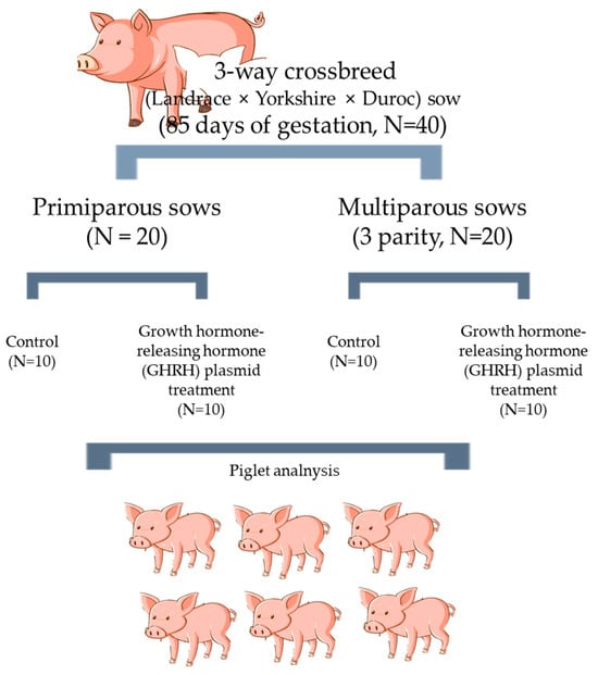 For the experimental treatment, the sows in the treatment group received an intramuscular injection to induce short-term anesthesia of ketamine hydrochloride (Yuhan Co., Ltd., Seoul, Republic of Korea) at a dosage of 1.1 mg/kg body weight, along with telazol (Zoetis Korea, Seoul, Republic of Korea) at a dosage of 1.85 mg/kg. Subsequently, the test substance containing GHRH plasmid at a concentration of 2.5 g/mL (LifeTide SW5, VGX Animal Health, Woodlands, TX, USA) was injected into the semimembranous leg muscle of the hind limb using a 21-gauge hypodermic needle. The injection site was subjected to electrical stimulation using a CELLECTRA electroporation device (VGX Pharmaceuticals, Blue Bell, PA, USA) to facilitate uptake of the drug into cells. The electrical stimulation parameters for the electroporation device were 0.5 A, five pulses, with a duration of 52 ms per pulse, and a 1 s interval between pulses. The control group underwent the same procedure as the treatment group. However, instead of the 5 mg dose of GHRH plasmid, a 2 mL phosphate buffer solution (PBS) was injected into the semimembranosus leg muscle of the hind limb.