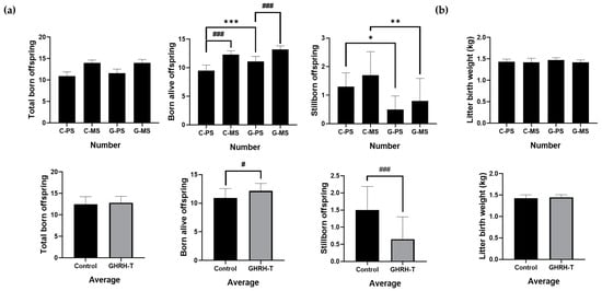 Effects of GHRH-T treatment on reproductive outcomes in primiparous and multiparous sows. (a) The reproductive outcomes were assessed by evaluating the total number of offspring produced, the number of offspring born alive, and the number of offspring born dead. Additionally, the sums and averages of these figures were calculated to provide a comprehensive overview of the reproductive results. (b) The evaluation also encompassed litter birth weight (kg) and the average total birth weight. C-S: Control primiparous sows, C-MS: Control multiparous sows, G-PS: GHRH-administered primiparous sows, G-MS: GHRH-administered multiparous sows. * p < 0.05, ** p < 0.01, *** p < 0.001, compared with the control group. # p < 0.05, ### p < 0.001, compared with each group.