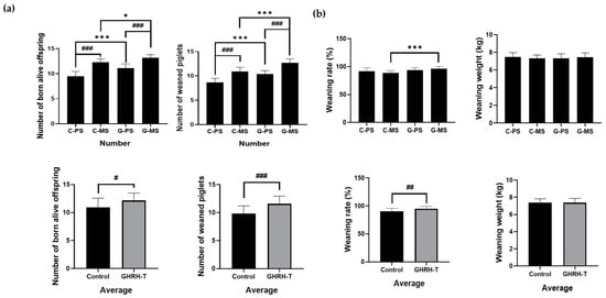 Effects of weaning piglet in primiparous and multiparous sows treated with GHRH-T. (a) Impact and average of GHRH-T on live births and weaned piglets in sows and (b) GHRH treatment on analyzing rates and weights in the litter. C-PS: Control primiparous sows, C-MS: Control multiparous sows, G-PS: GHRH-administered primiparous sows, G-MS: GHRH-administered multiparous sows. * p < 0.05, *** p < 0.001, compared with the control group. # p < 0.05, ## p < 0.01 ### p < 0.001 compared with each group.