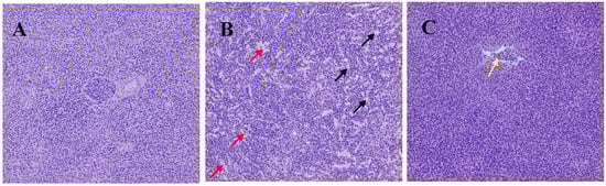 Figure 1. Histological examination of the spleen in broiler chickens of the control group, heat stress group and heat stress + PE group (n = 6/group). Representative images were captured by a microscope (NIKON DS-U3) at 200× (A) control group; (B) heat stress group; (C) heat stress + PE group). Black arrow: the boundary between the red and white pulp within the tissue is blurred, and no typical splenic nodule structure is observed; large areas of abnormal proliferation of blood vessels in the spleen are densely arranged and significantly increased in number. Red arrows: multiple small focal necrotic cavities can be seen in the spleen, accompanied by a small amount of heterophil infiltration and loose tissue structure. Yellow arrow: the white pulp within the tissue diffuses throughout the entire spleen, and the boundary between the red and white pulp is unclear; in the red pulp, some inflammatory cells in the blood vessels can be seen to aggregate into clusters (mainly lymphocytes).