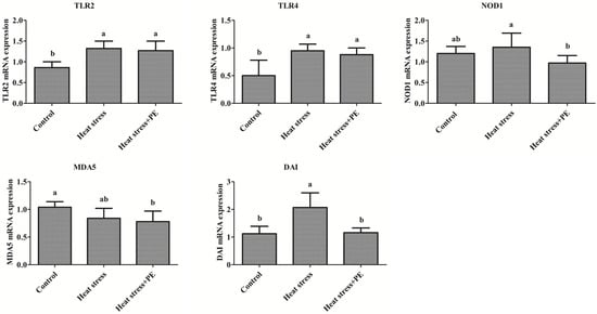 Figure 2. Main pattern recognition receptors mRNA expression levels in the spleen of broiler chickens of the control group, heat stress group and heat stress + PEt group (n = 6/group). All data were presented as mean ± standard deviation. There were significant differences between different lower-letters (a and b) (p < 0.05), but no significant differences between the same lower-letters (p < 0.05).