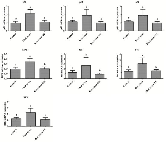 Figure 3. Transcription factors mRNA expression levels in the spleen of broiler chickens of the control group, heat stress group and heat stress + PE group (n = 6/group). All data were presented as mean ± standard deviation. There were significant differences between different lower-letters (a and b) (p < 0.05), but no significant differences between the same lower-letters (p > 0.05).