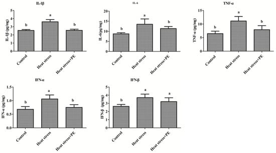 Figure 4. Inflammatory cytokines concentration in the spleen of broiler chickens of the control group, heat stress group and heat stress + PE group (n = 6/group). All data were presented as mean ± standard deviation. There were significant differences between different lower letters (a and b) (p < 0.05), but no significant differences between the same lower letters (p > 0.05).